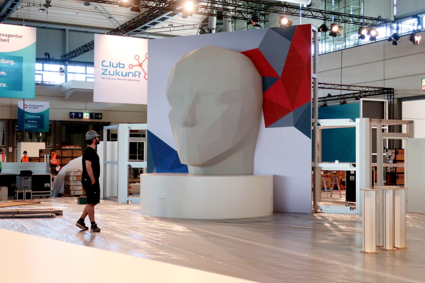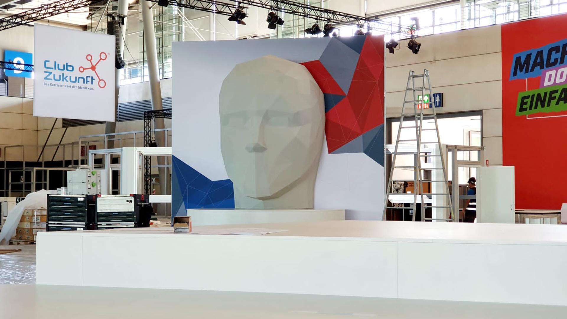 Exklusiv zur IdeenExpo 2022 präsentiert der Premiumaussteller NiedersachsenMetall ein Highlight der Superlative: Projiziert auf einen 4,5 Meter hohen Kopf in Polygonoptik werden die Besucherinnen und Besucher auf dem Stand der Metall- und Elektro-Industrie sich selbst tief in die Augen blicken können. Möglich macht das eine spannende Technik, die in Videospielen und Animationsfilmen, aber auch in der Architektur, dem Maschinenbau oder der Medizintechnik zum Einsatz kommt: das 3D-Modelling. Hierbei wird die Oberfläche eines Objekts als koordinatenbasierte Darstellung in drei Dimensionen durch die Manipulation von Kanten, Scheitelpunkten und Polygonen simuliert. Auf der IdeenExpo gelingt das anhand eines Portraitfotos der Gäste. Die Daten werden in eine 3D-Projektion umgewandelt und mit Hilfe zweier Hochleistungsprojektoren live auf den überdimensionale Styroporkopf geworfen - ein weithin sichtbarer Blickfang in der Halle 9.