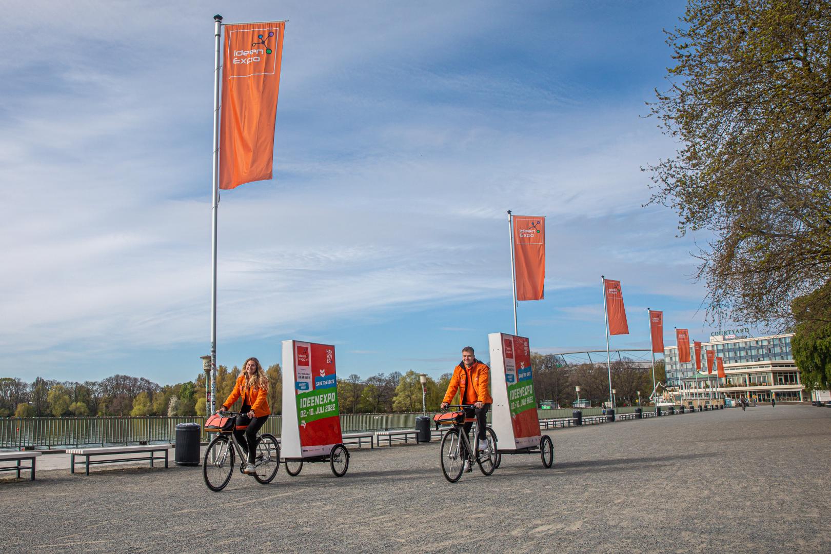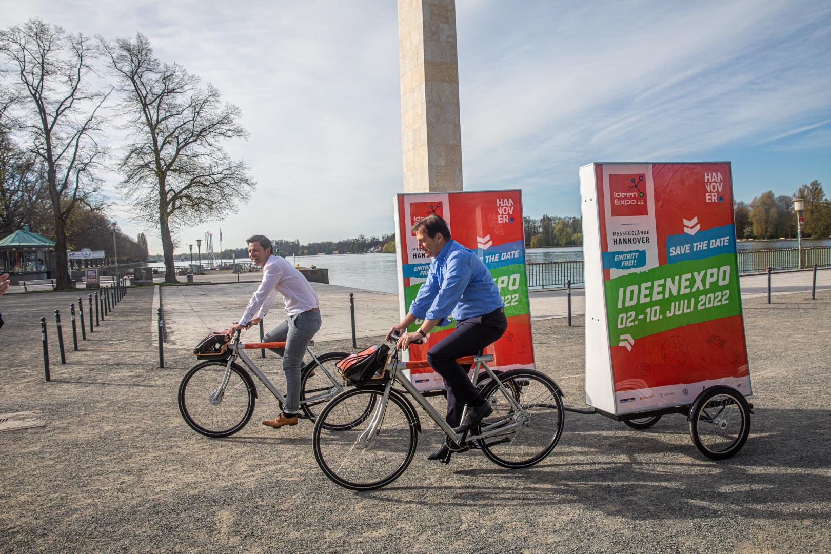 die ersten Plakate selbst in Szene - indem sie mit IdeenExpo-Lastenrädern am Maschsee entlangfahren.