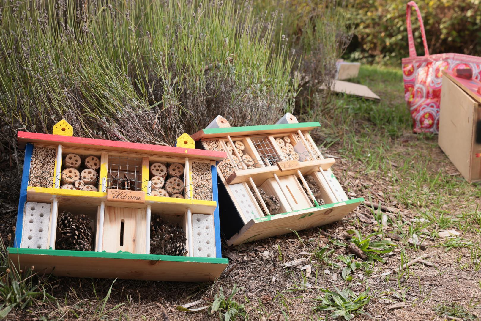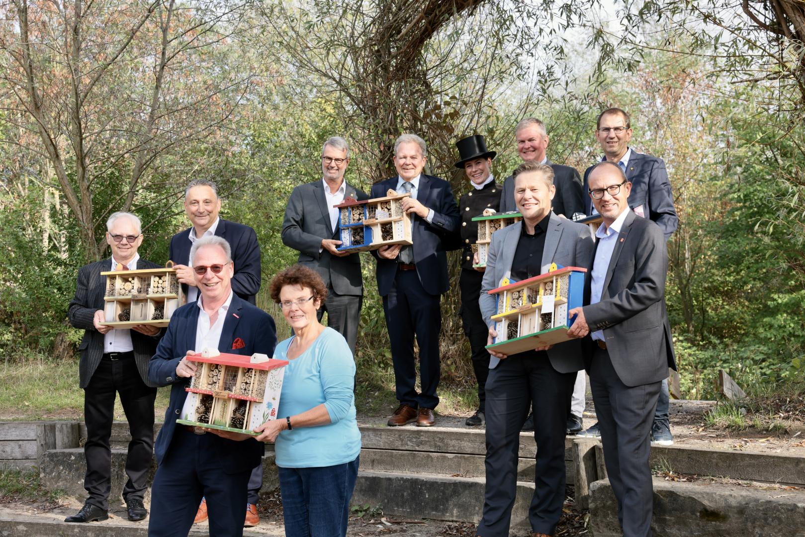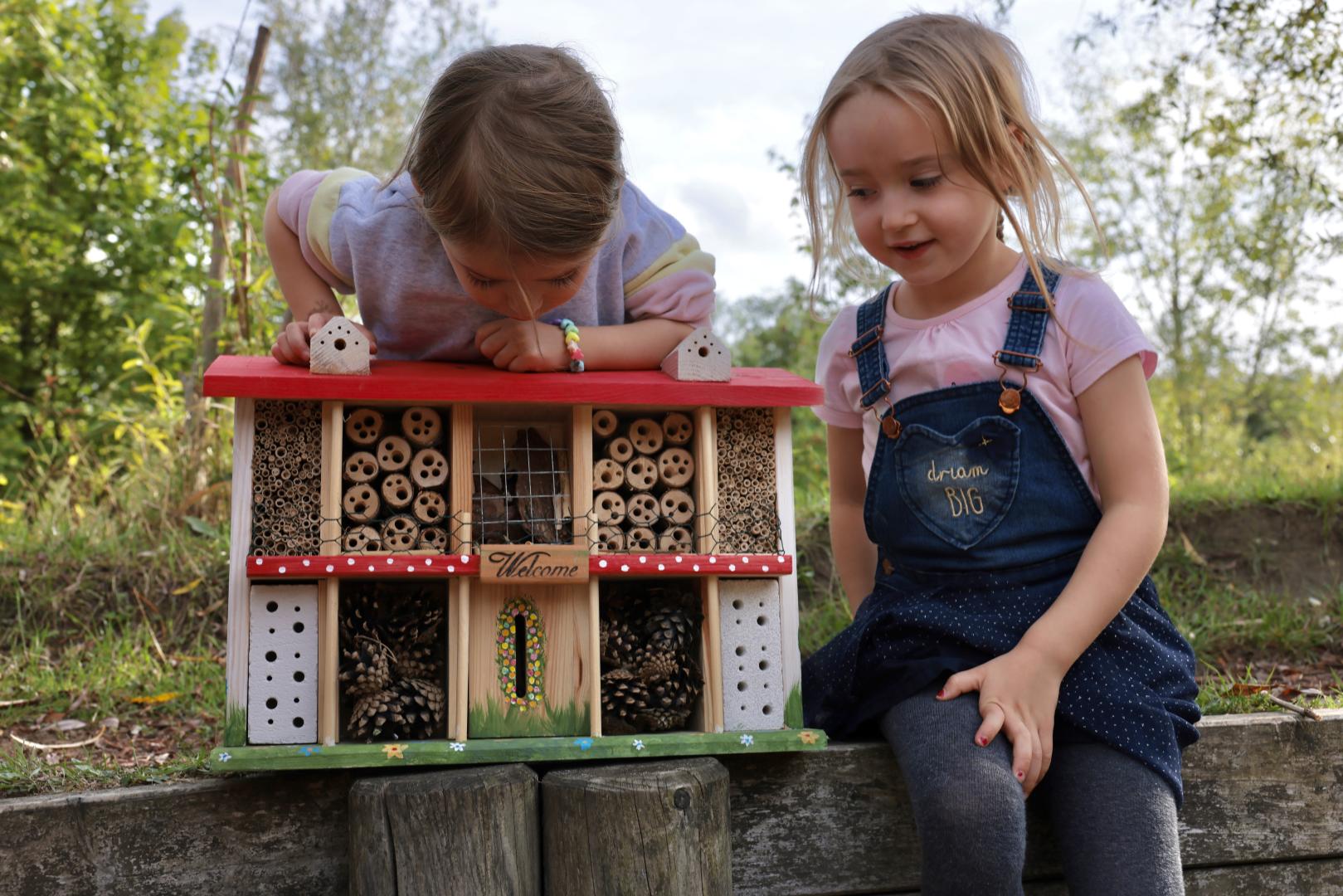 Darüber hinaus gibt es auch noch handfeste Unterstützung: Während der IdeenExpo vom 2. bis 10. Juli 2022 haben Besucherinnen und Besucher auf dem Außengelände in einem gemeinsamen Workshop der Maler und Tischler insgesamt zehn Insektenhotels angefertigt, die zusätzlich zu der Spende an den Kinderwald übergeben wurden.