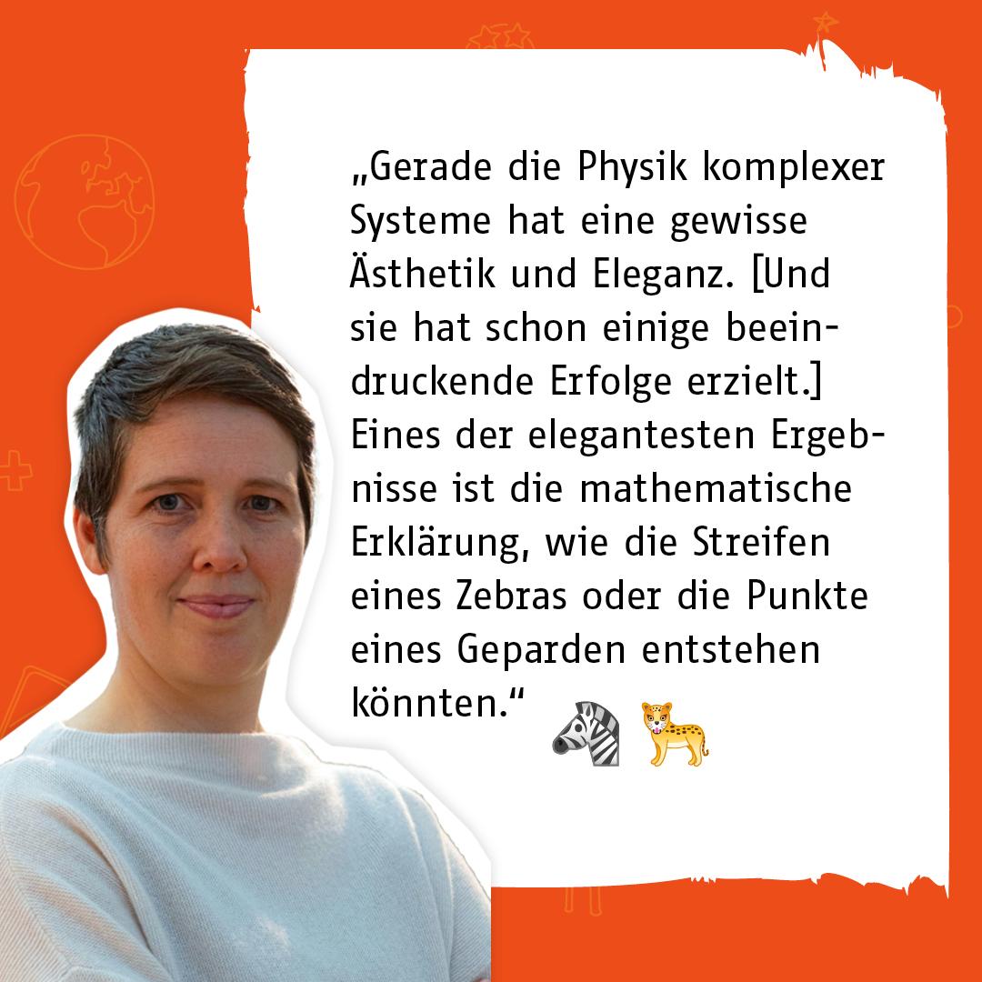 Viola Priesemann: Gerade die Physik komplexer Systeme hat eine gewisse Ästhetik und Eleganz. Und sie hat schon einige beeindruckende Erfolge erzielt. Eines der elegantesten Ergebnisse ist die mathematische Erklärung, wie die Streifen eines Zebras oder die Punkte eines Geparden entstehen könnten. Diese Erklärung hat Alan Turing hergeleitet (Verlinkung Video https://youtu.be/alH3yc6tX98). Er hat zwei Gleichungen aufgestellt, die die effektive Interaktion zwischen den Farbpartikeln beschreiben. Wenn man in den zwei Gleichungen nur ein wenig die Bedingungen ändert, gibt es ganz verschiedene Muster – Streifen oder auch Punkte, wie zum Beispiel beim Geparden. Es ist also eine ganz einfache und elegante Erklärung, wie ein Zebra zu seinen Streifen kommen könnte, aber auch wie Streifen, Punktmuster oder, wenn man es erweitert, auch Wellen, Waben, Spiralen und andere Muster entstehen. Solche Phänomene erforschen wir am Campus Göttingen, und für mich ist das wahnsinnig inspirierend.