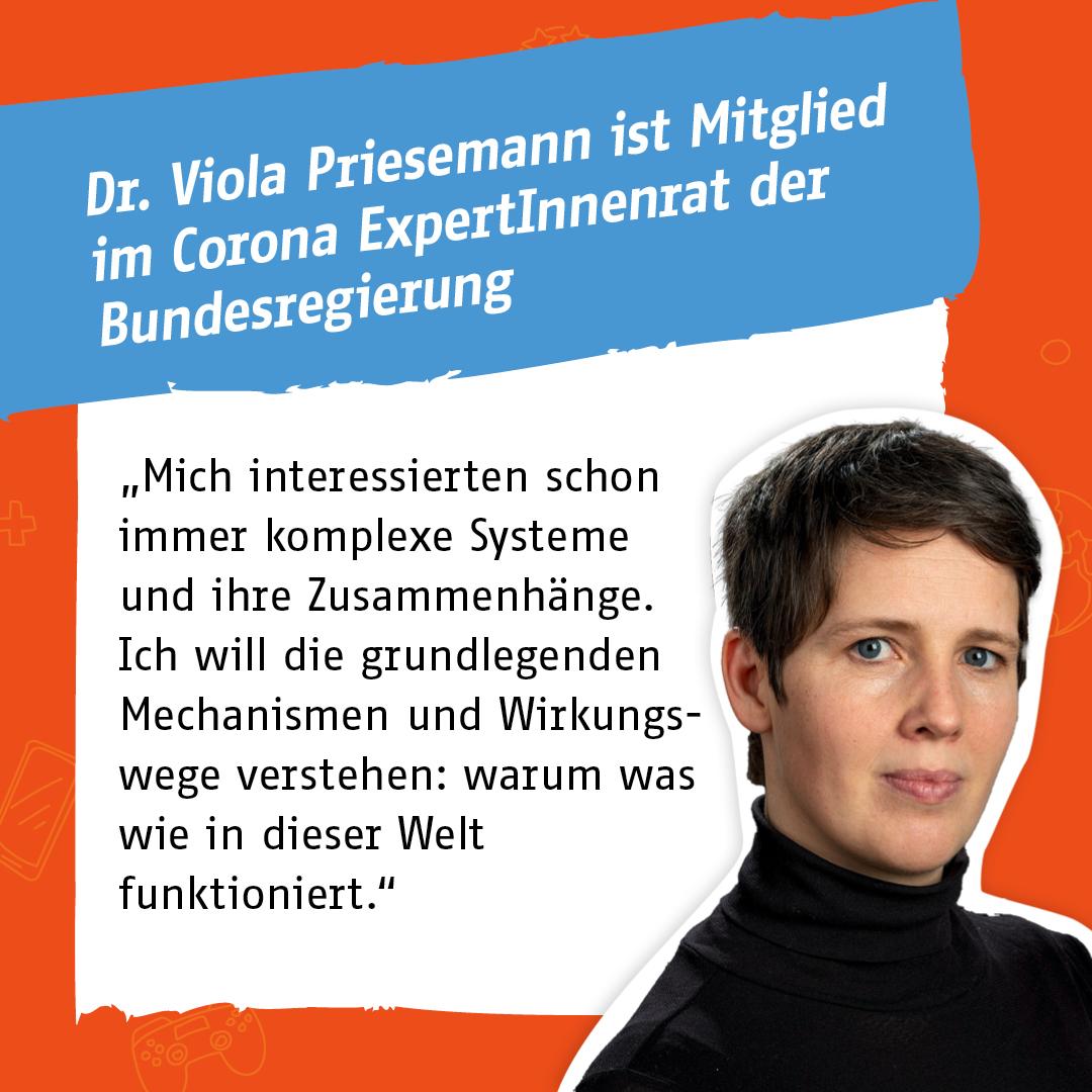 Die Physikerin Dr. Viola Priesemann wurde bereits mit zahlreichen Preisen ausgezeichnet, darunter der Dannie-Heineman-Preis der Akademie der Wissenschaften zu Göttingen und der Wissenschaftspreis Niedersachsen. Sie leitet eine Forschungsgruppe am Max-Planck-Institut für Dynamik und Selbstorganisation in Göttingen und lehrt an der Universität Göttingen. Aktuell gehört sie außerdem dem Corona-Expertenrat der Bundesregierung an.