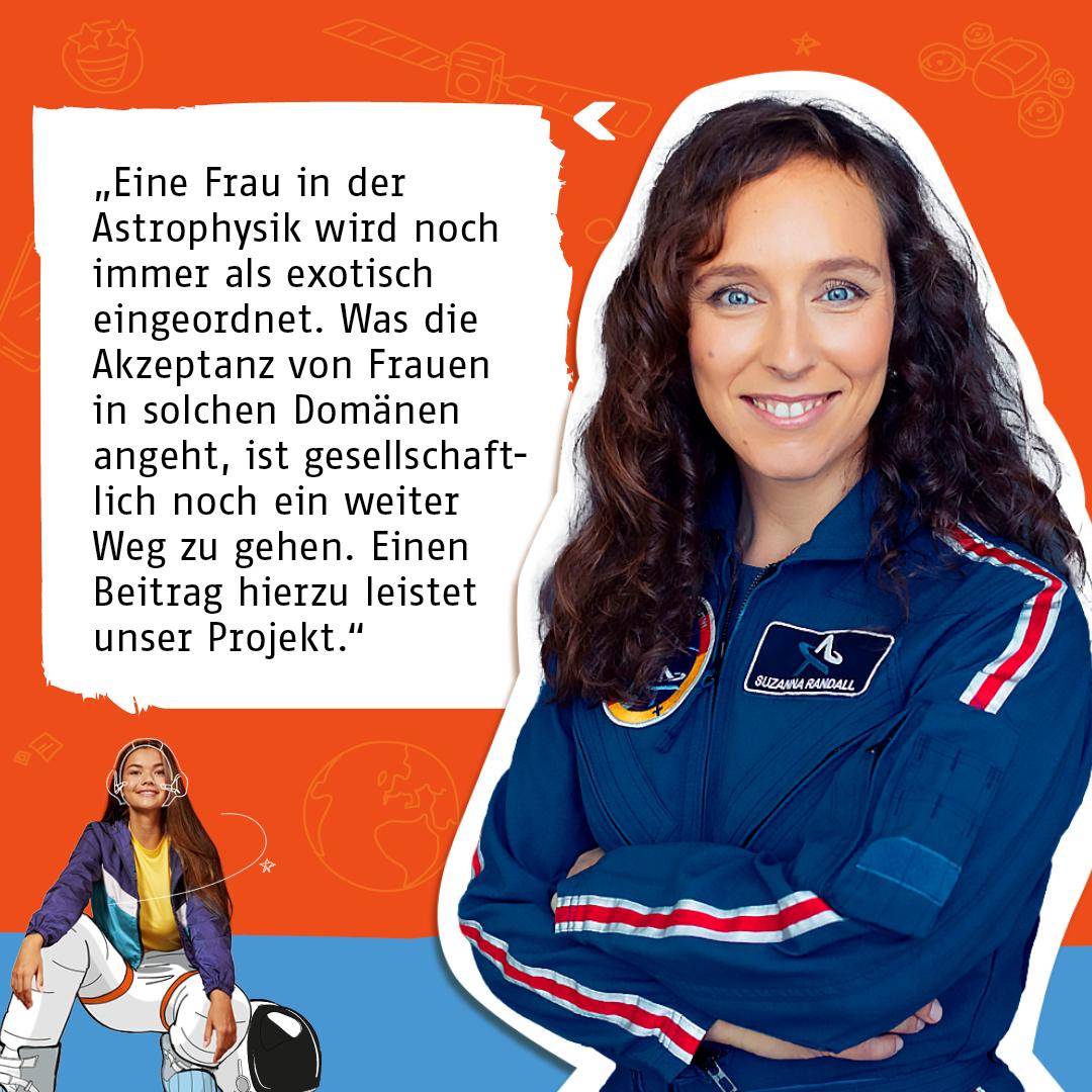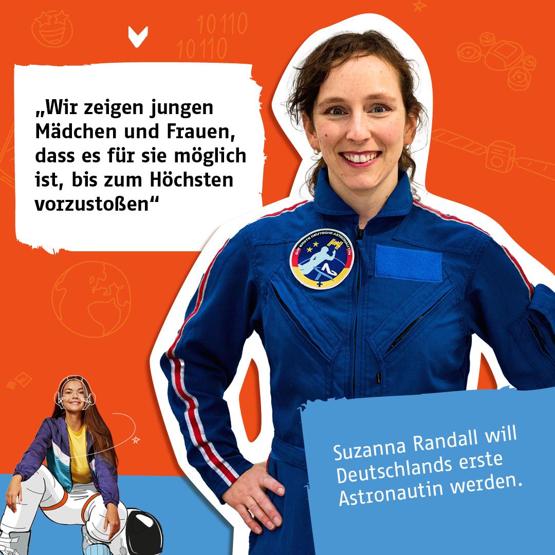 Suzanna Randall: Ich wollte schon immer Astronautin werden, das war ein absoluter Kindheitstraum von mir. Dass die Initiative bewusst ein Role Model kreieren möchte, machte die Bewerbung dann noch attraktiver fĂŒr mich. Mit unseren Taten, also dass wir, meine Kollegin Insa Thiele-Eich und ich, als erste deutsche Frauen ins Weltall fliegen, zeigen wir jungen MĂ€dchen und Frauen, dass es auch in den noch immer mĂ€nnerdominierten DomĂ€nen wie der Raumfahrt aber auch in anderen MINT-Bereichen möglich fĂŒr sie ist, erfolgreich zu sein â und symbolisch bis zum Höchsten vorzustoĂen, dem Weltall.