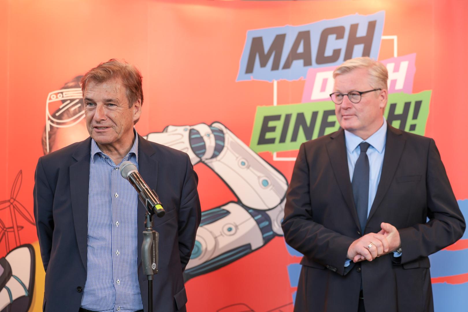 Vertreterinnen und Vertreter von NiedersachsenMetall, AOK, Salzgitter AG, Volkswagen und der Autostadt GmbH, der norddeutschen Chemieverbände, ZF, dem NDR und der BBS ME – Otto-Brenner-Schule standen bereit, um im Großen Foyer des Landesfunkhauses Schülerkorrespondentinnen und -korrespondenten und der Presse ihre Exponate vorzustellen. Als prominenter Unterstützer zeigte sich Dr. Bernd Althusmann, Niedersächsischer Minister für Wirtschaft, Arbeit, Verkehr und Digitalisierung, begeistert von den innovativen Exponaten.